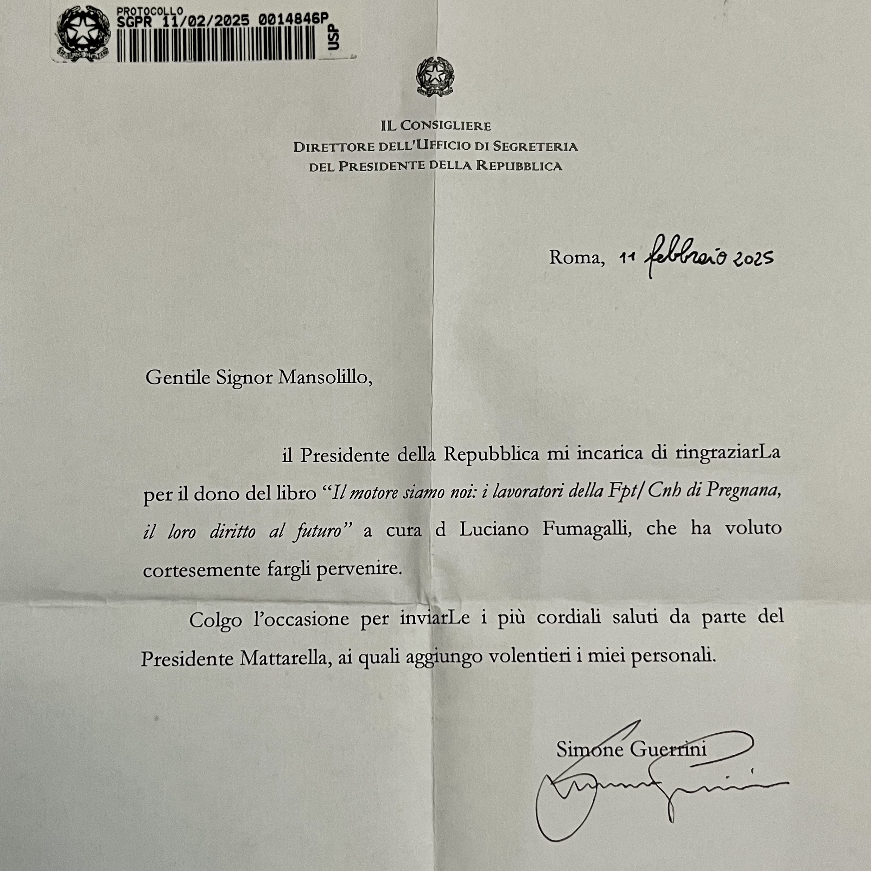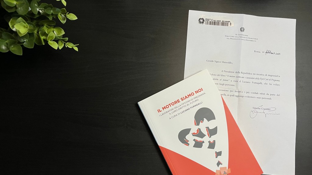 La lettera era una risposta alla copia del libro “Il Motore siamo Noi”, che insieme a Marco Nicosia avevo inviato al Presidente Mattarella, accompagnata da una lettera personale. Un gesto simbolico che non solo rappresentava il nostro impegno nel raccontare la vertenza degli ex lavoratori della FPT Industrial (ex Aifo) di Pregnana Milanese, ma anche il nostro desiderio di sensibilizzare le istituzioni e l’opinione pubblica su una crisi che ha segnato profondamente il tessuto sociale di una comunità.