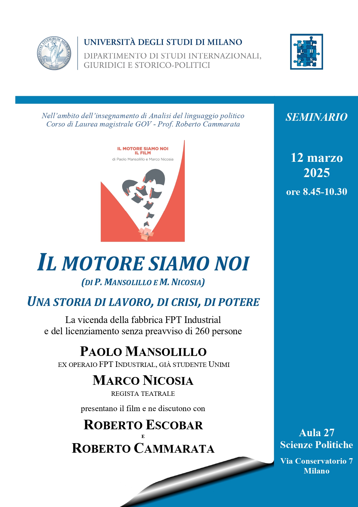 Il seminario, organizzato dal professor Roberto Cammarata che si è svolto al Dipartimento di Studi Internazionali Giuridici e Storico-Politici, è stato pensato nell’ambito del corso di “Analisi del linguaggio politico”, tenuto dallo stesso professor Cammarata. Era il contesto ideale per presentare il nostro film documentario Il Motore siamo Noi, un progetto che nasce dall’omonimo libro scritto da Luciano Fumagalli, edito da People, e che racconta le storie di chi ha dedicato la propria vita alla FPT Industrial (ex AIFO) di Pregnana Milanese, un’azienda che ha rappresentato un punto di riferimento per l’occupazione del territorio stesso.