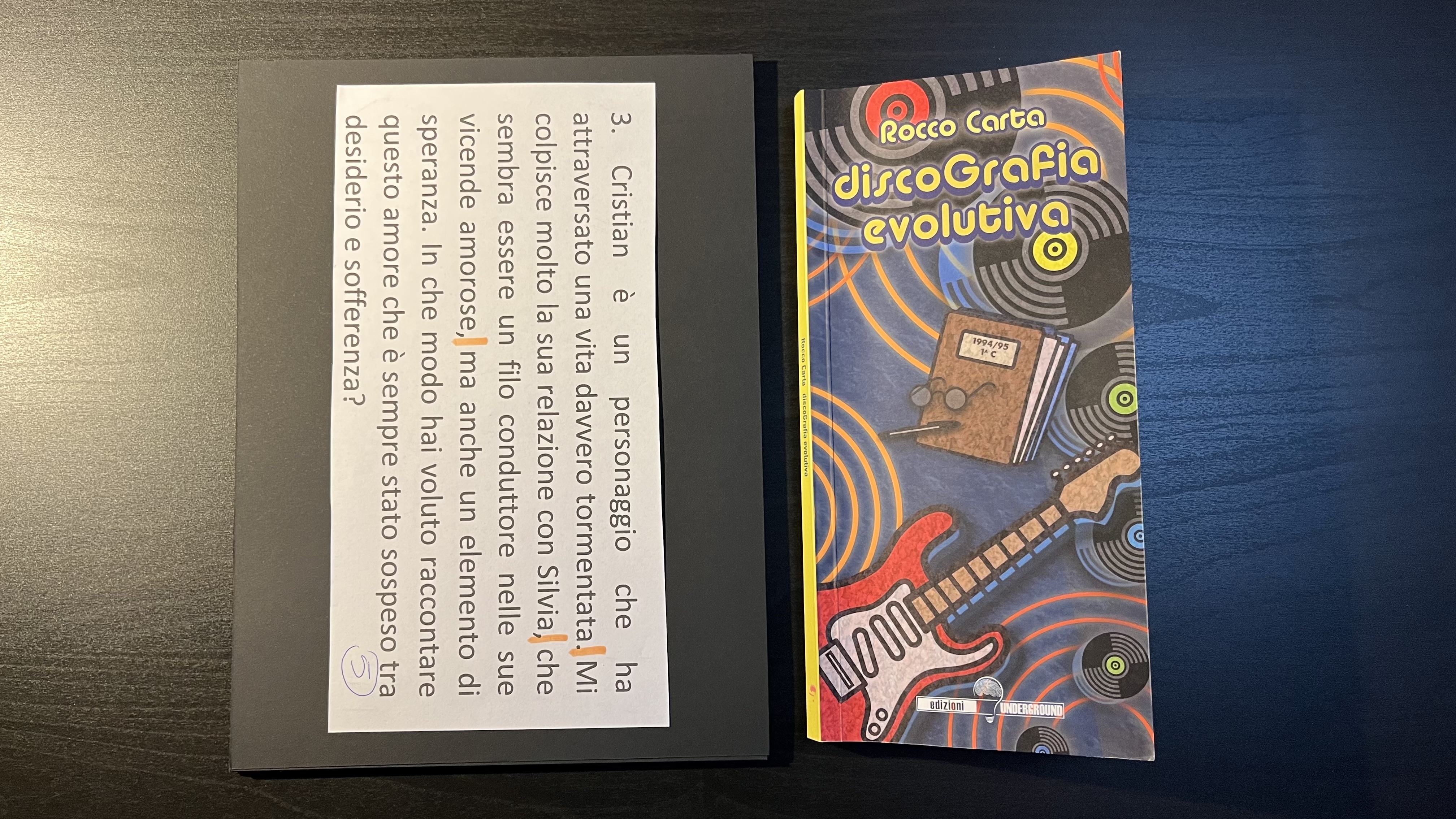 Un altro passaggio importante è stato quando, durante la mia seconda domanda, ho toccato un tema centrale del libro: la musica. Discografia evolutiva racconta la vita di Cristian, un uomo segnato dal dolore e dalle difficoltà, ma anche dalla ricerca di un senso profondo. La musica, per lui, non è solo un accompagnamento, ma una vera e propria chiave di lettura per la sua esistenza. L’ho sottolineato nella domanda che gli ho posto a Rocco: “La musica è solo un sottofondo o è davvero parte integrante della vita di Cristian?” Questa riflessione mi è venuta guardando su YouTube i video delle canzoni che fanno da colonna sonora al libro. In particolare, il video del vinile n° 9 degli Scorpions, Wind of Change, mi ha colpito. A distanza di 36 anni, ci siamo forse dimenticati di quel vento di speranza e cambiamento che soffiava nel 1989? Quella musica, come una metafora di quel periodo storico, mi ha fatto riflettere su quanto il mondo sia cambiato, ma anche su quanto quella speranza sembri oggi lontana.