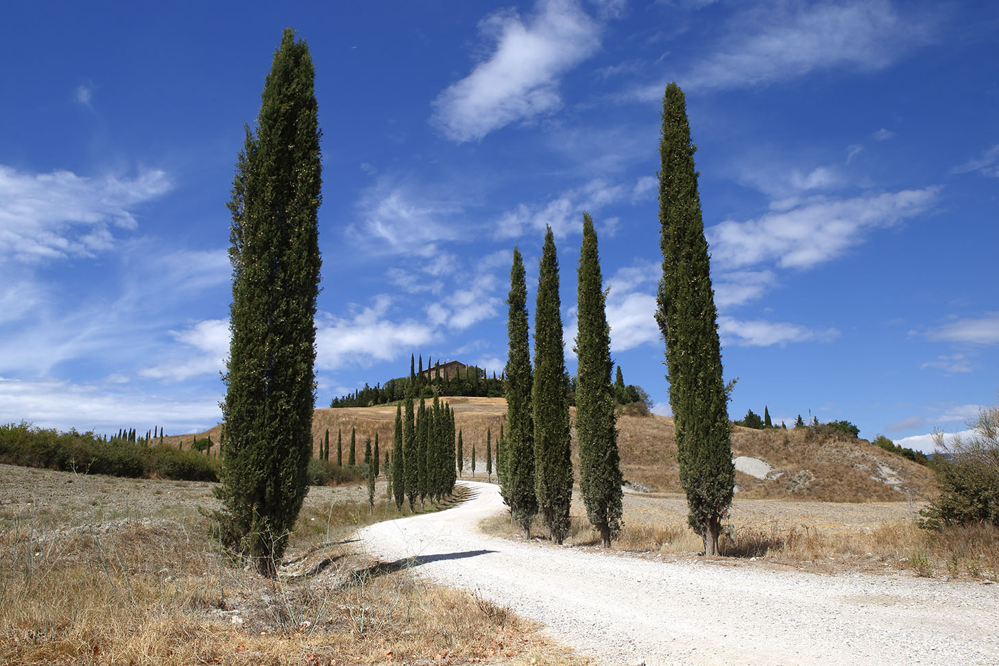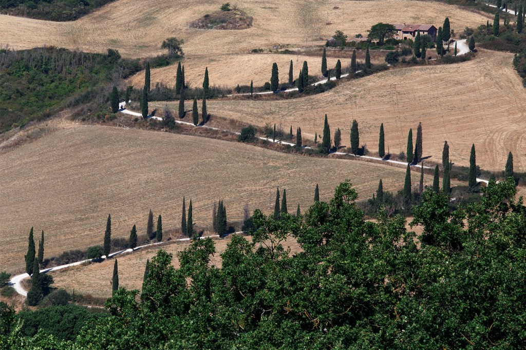 La si scorge in lontananza dalla strada provinciale tra San Quirico e Pienza. Dopo aver lasciato l’auto in un ampio parcheggio, si percorre a piedi un sentiero che conduce a uno dei simboli iconici della Val d’Orcia.