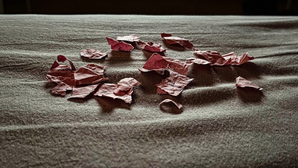Dopo aver fatto in mille pezzi il bigliettino, come per essersi liberato da un peso, si chiuse nel bagno.