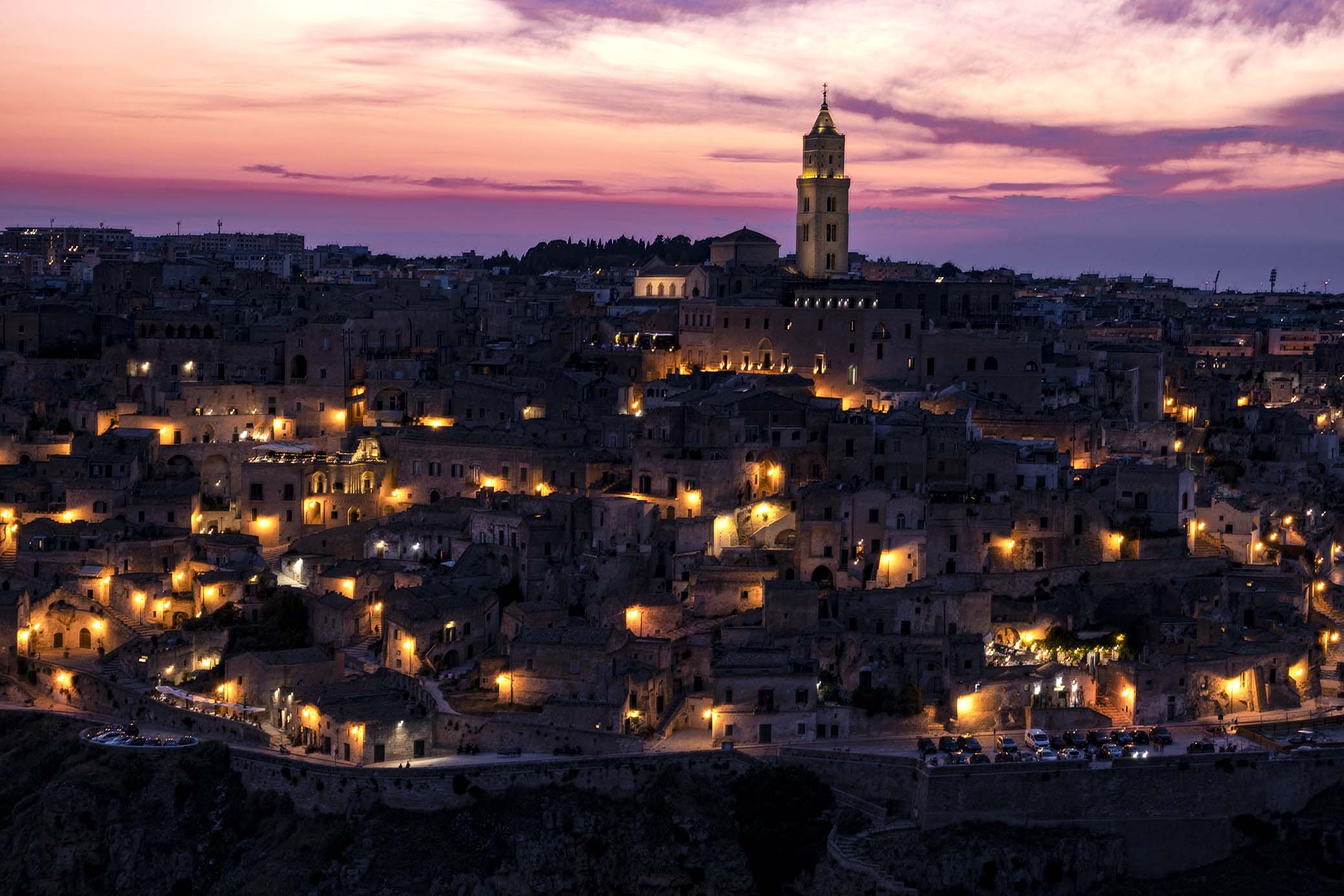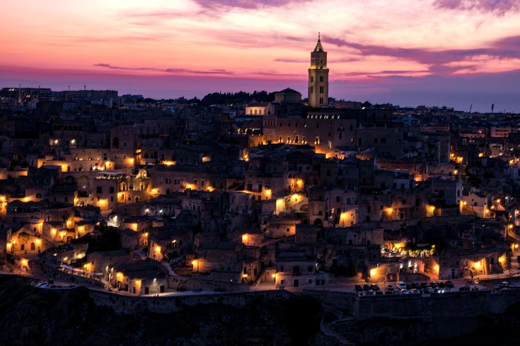 Con l’aggiunta di queste altre due storie al nostro viaggio, finalmente potevamo dedicarci alla visita della città, semplicemente mozzafiato. Nel tardo pomeriggio del giorno seguente, sabato 23, avevamo prenotato un tour: una visita guidata nel cuore del Parco della Murgia Materana, a pochi passi dai Sassi. Un’avventura a piedi tra canyon spettacolari, grotte preistoriche, chiese rupestri e paesaggi mozzafiato, durante la quale una guida esperta del territorio ci spiegò la conformazione dell’area e, verso il tramonto, ci condusse in uno dei luoghi scelti per la crocifissione nel film La Passione di Cristo di Mel Gibson, il Golgota. Da lì si godeva di un punto di osservazione incredibile sulla città che, al calar del sole, regalava uno spettacolo davvero indimenticabile.